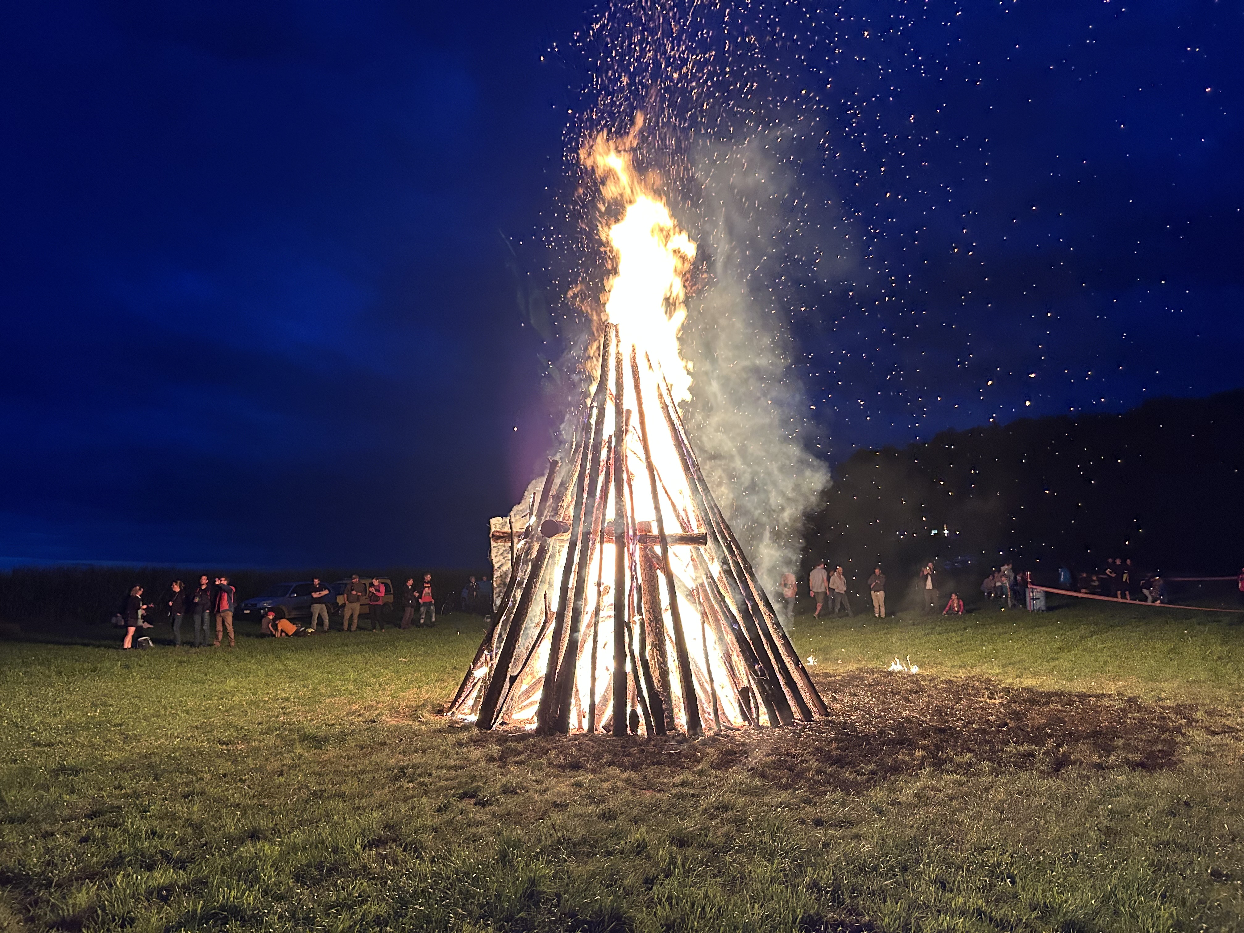 Beim Eindunkeln gegen 21.30 Uhr entzündete Förster Felix Keller das Höhenfeuer auf der Höngerwiese. Bald machten sich die letzten Gäste auf, das knisternde Feuerspektakel mit dem Funkenflug aus der Nähe zu verfolgen – manch einer mit einer Flasche Wein im Rucksack, um nicht nochmals zurück zum Forstwerkhof gehen zu müssen. Anders als im Vorjahr blieb der Wind, der für einen kräftigen Glutregen sorgte, aus.